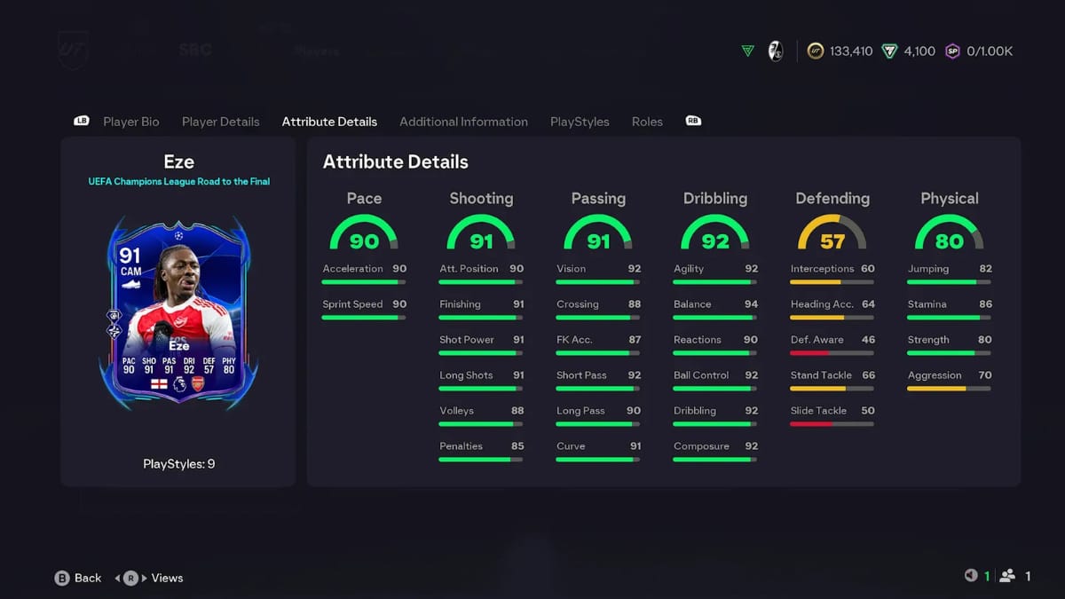 Eberechi Eze (91 CAM, ~322K) — Good SBC. He is incredibly quick and agile, and he might just be the new meta for that attacking midfield spot. The stats are great, and the price is fair for what you get.