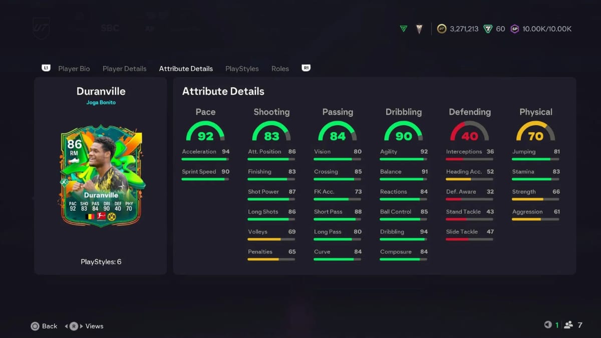 Julien Duranville (86 RM, ~63.5k) — Pass. Great pace (92) and dribbling (90), but this card should be 25k max. The Joga Bonito tax is real here. Overpriced for an 86 rated card.